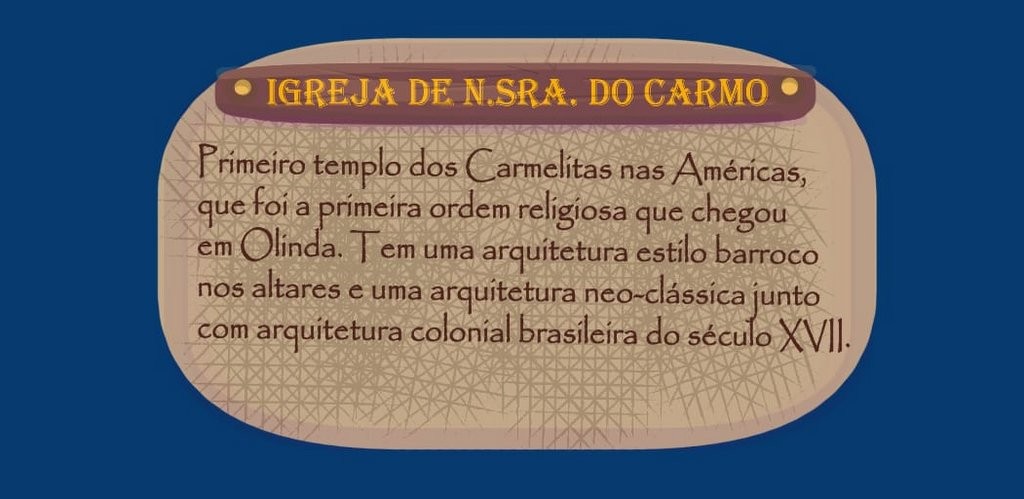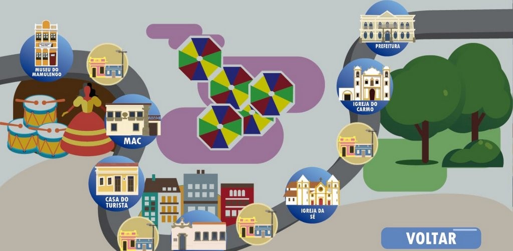 Os criadores exploraram aspectos da cultura, história e turismo de Olinda para compor a trajetória e o cenário. A partida se passa em ambientes comuns para quem circula pelo Sítio Histórico, como a Praça do Carmo, os Quatro Cantos, a Prefeitura, etc. Na interface, os descritivos apresentam dados relevantes sobre os pontos, colaborando para o apelo educativo do produto. O jogo tem 11 níveis e, à medida que eles vão aumentando, cresce o número de provas e diminui o tempo.